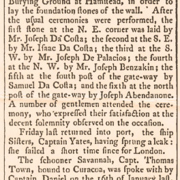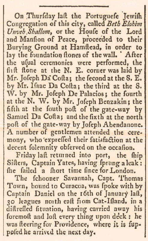 Isaac DaCosta’s brother, Abraham DaCosta (d. 1786), served KKBE as hazan from circa 1762 to 1764. In the latter year, Isaac transferred ownership of his family burial ground on Coming Street to the congregation “for the use of those who observed the regulations of Beth Elohim.” In the same year, however, a dispute within the congregation led to Abraham’s resignation as hazan. A decade later, the DaCostas again found themselves at odds with other members, this time owing to tensions between the longstanding congregants, who were mostly of Sephardic ancestry, and the growing number of Ashkenazim, newcomers from German-speaking states or Eastern Europe. The split resulted in the establishment of a separate synagogue, Unveh Sholom, which was active on Beresford (Fulton) Street by 1783, and might have been founded before the Revolution.