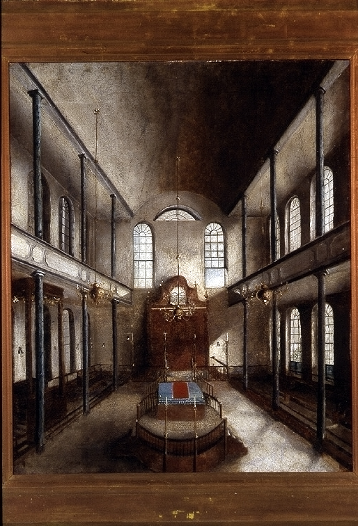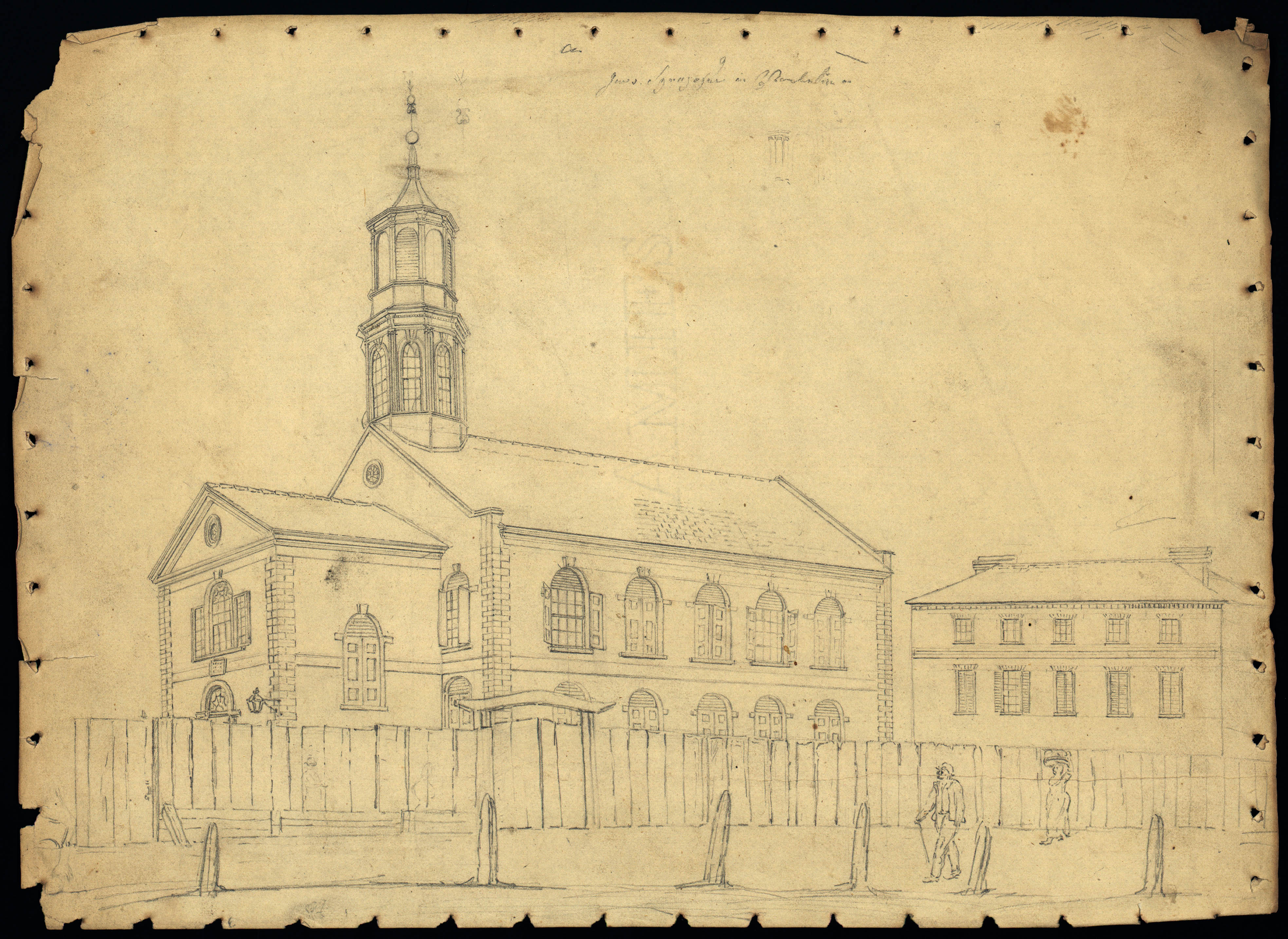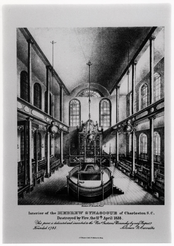 In April 1838, the synagogue, along with nearly every other structure in the neighborhood, was lost in a fireLate in the evening of Friday, April 27, 1838, a fire began near the corner of Beresford (today’s Fulton) Street and King Street. It was driven by wind from the southwest to East Bay Street and beyond, destroying more than 1,100 structures—dwellings, tenements, boarding houses, stores, workshops, kitchens, stables and sheds, and four houses of worship, including Synagogue Kahal Kadosh Beth Elohim, a fixture of the city skyline since its completion in 1794. Nearly 70 of the 560 homes and businesses that burned were owned or rented by Jews. that destroyed much of the center of Charleston in a wide path across the city from King Street to the Cooper River. Our only image of the interior comes from a painting made immediately after the disaster by twenty-three-year-old Solomon Nunes Carvalho (1815–1897), who in September 1838 offered the canvas to the trustees “for such compensation as the Board may deem proper to allow.” (They paid him $50.) Carvalho also produced a lithograph of the synagogue’s exterior, which provides a view of the building from the street. (There is also a drawing from 1812, made by John Rubens Smith (1775–1849), of the temple’s exterior.) All that survives from the original structure are four cornerstones discovered in 1951 when the foundation of the present temple was repaired, the marble plaque above the entrance to the sanctuary, bases of the candlesticks on the current bimah, and the wrought iron fence along Hasell Street, constructed in 1819.