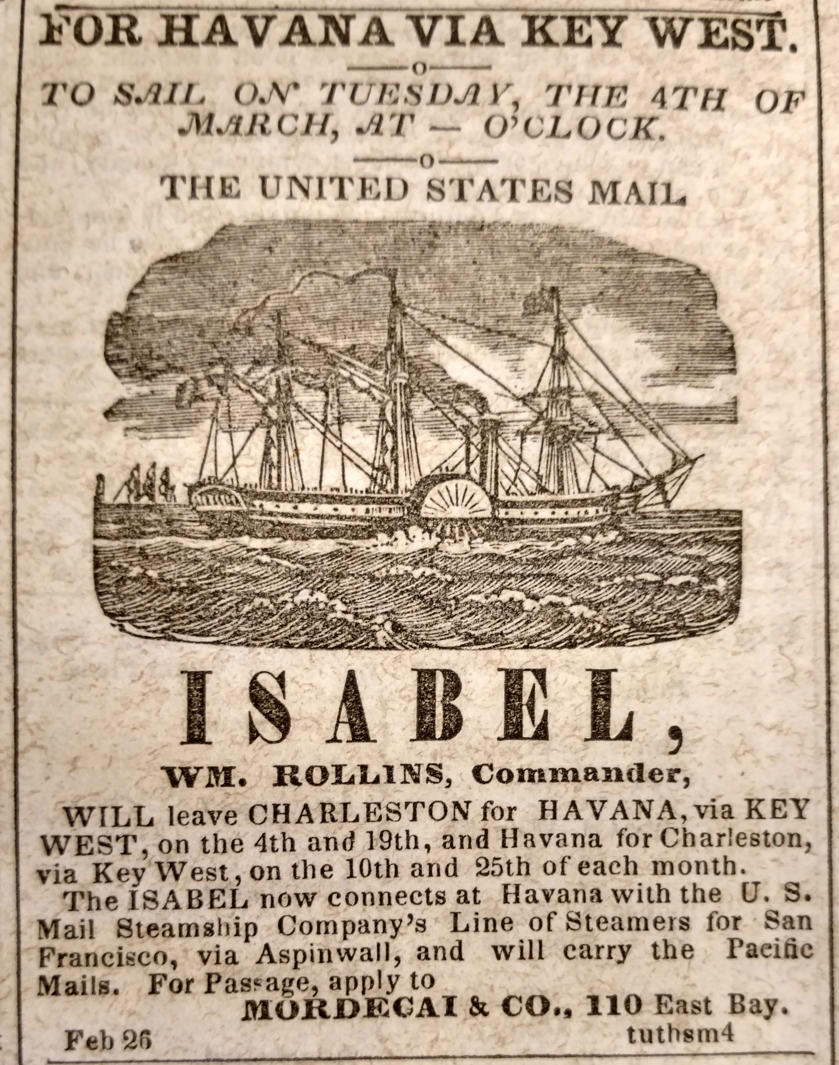 Moses Cohen Mordecai (1804–1888) purchased this grand downtown residence in 1837 after amassing a fortune as a vendue master, or auctioneer, and importer of fruit, sugar, tobacco, and coffee. He also owned a steamship line that, in 1848, secured a federal contract to carry mail between Charleston and Havana, with stops in Savannah, Georgia, and Key West, Florida. In 1850, Mordecai served on the committee for arrangements for the funeral of John C. Calhoun, an architect of secession, but the next year he helped launch the anti-secessionist newspaper Southern Standard. Once hostilities began, however, he threw his support behind the Confederacy: in April 1861, Mordecai’s flagship The Isabel, named for his wife, Isabel Rebecca Lyons (1804–1896), carried Union troops off Fort Sumter, following the opening bombardment of the Civil War.