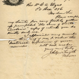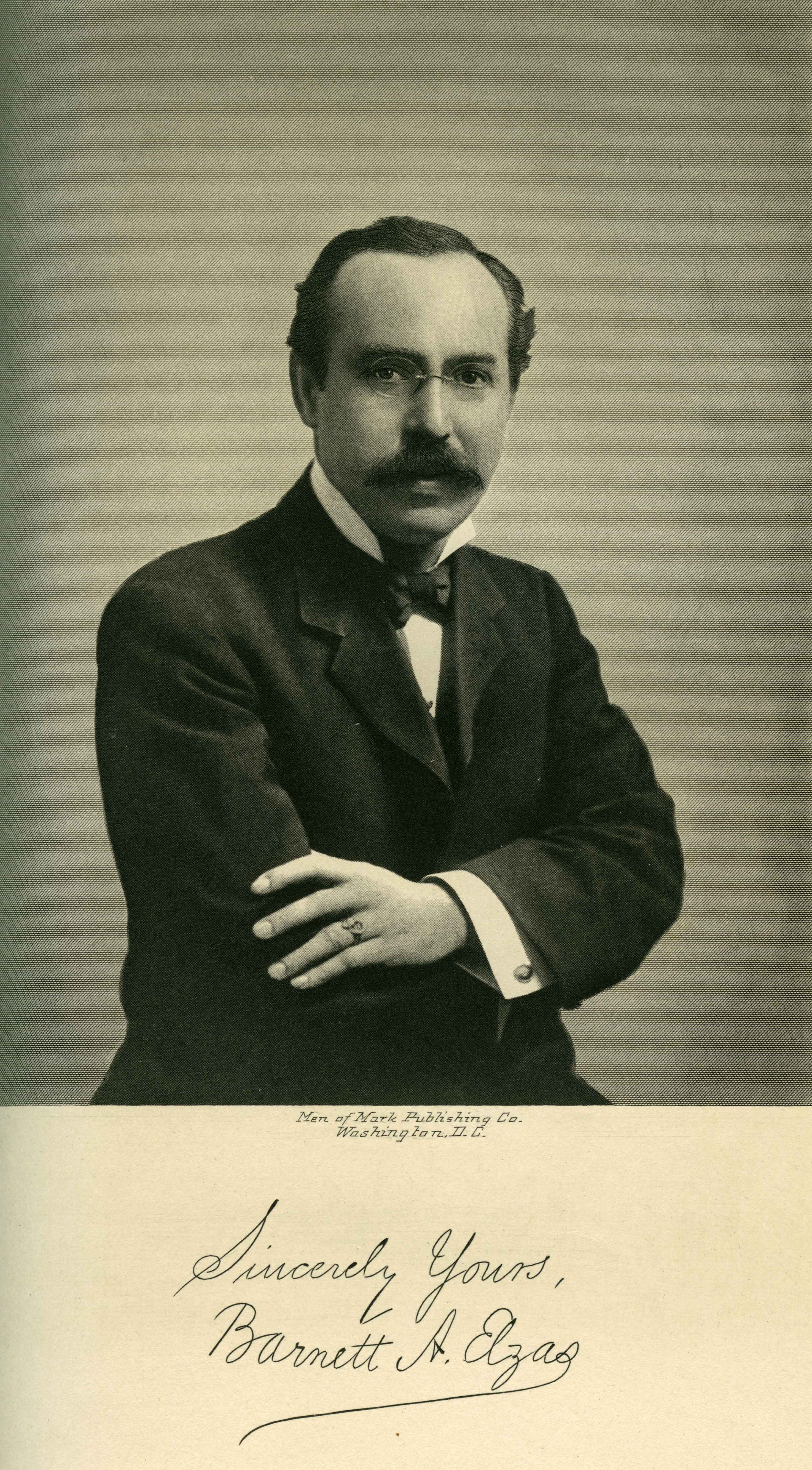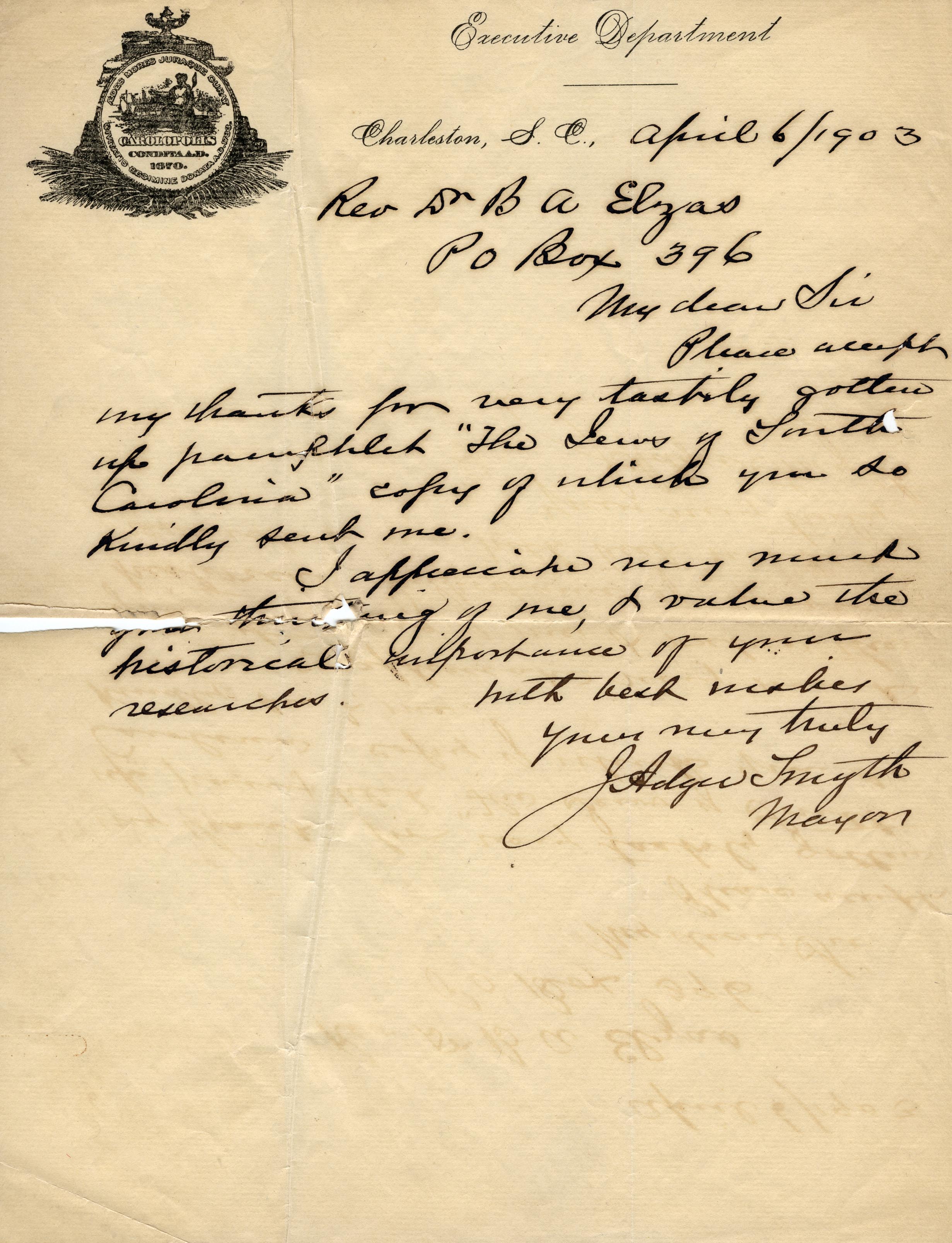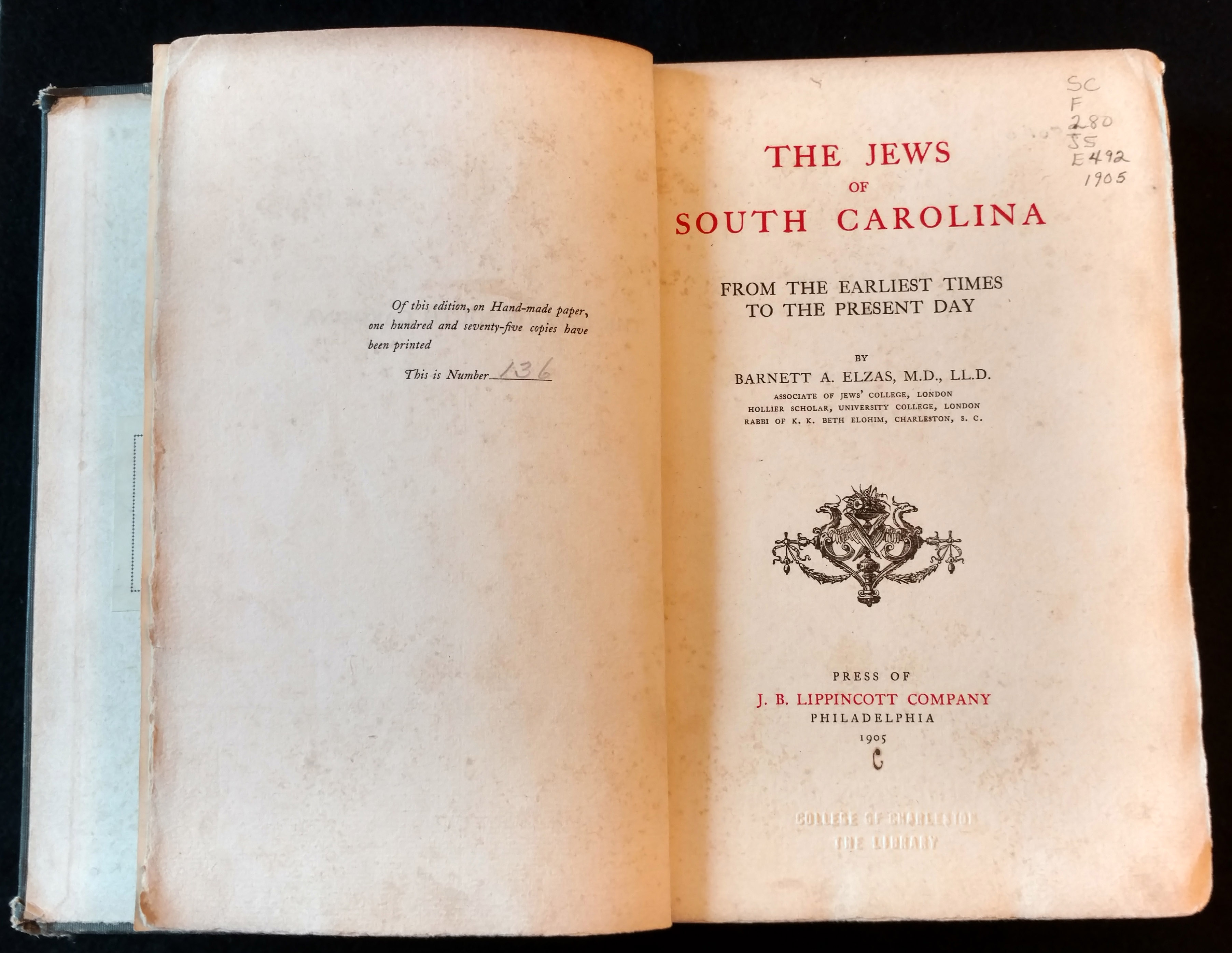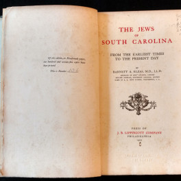 Barnett A. Elzas (1867–1936), spiritual leader of Kahal Kadosh Beth Elohim synagogue from 1894 to 1910, and a noted scholar of Charleston Jewish history, led a peripatetic life, before, after, and during his tenure in Charleston. Born in Eydkuhnen, Germany, Elzas was educated in London, and later in Toronto, where he first served as a rabbi. He then went to Sacramento, California, before moving to Charleston. While serving KKBE, he not only graduated from the Medical College of South Carolina, but he also published a series of pamphlets on Charleston’s history, Jewish cemeteries across South Carolina, Charleston’s particular Jewish history, and his magnum opus, The Jews of South Carolina (1905). Elzas wandered in the city, as well as in its history, living at 11 Water Street (1903), 35 Coming Street (1905), and other rented houses, before settling at the Charleston Hotel with his wife, Annie, for the last few years of his rabbinate. (The Charleston Hotel was demolished in 1960.)