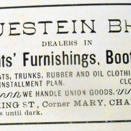 After raising five children and managing an independent business in her widowhood, Mrs. Betty Bluestein finally retired in the early twentieth century. Her son Lazarus opened his own menswear store at 493 King Street; in 1905 Moses joined that firm, which became L & M Bluestein, and later Bluestein & Levin/The B&L Store (Moses Bluestein and Julius Levin), 485 King Street.