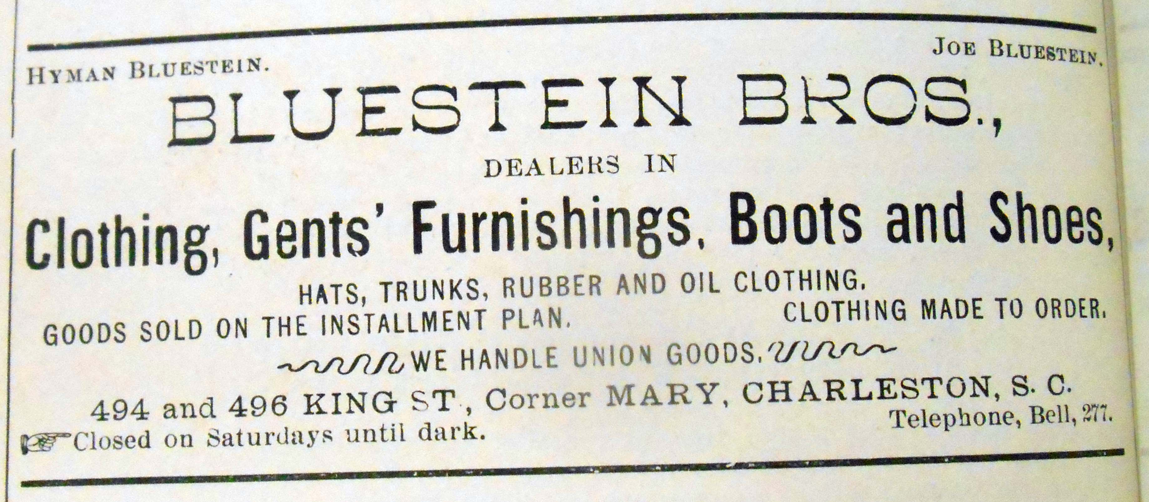 This family business went through many permutations, generations, and locations before it settled at its current address. Meyer Bluestein (1847–1892) emigrated around 1881 from Berdichev, Russia, with his wife, Betty Piatigorsky Bluestein (1846–1911), a daughter of Dvosy and Jacob (Piatigorsky) Jacobs (Dvosy and Jacob changed their surname from Piatigorsky to Jacobs). Bluestein is listed in the 1890 Charleston City Directory as a dry goods and clothing merchant with shops at 468 King Street and 549 King Street. Meyer and Betty lived above the latter address with their children: Hyman, Moses, Joseph Solomon (“Joseph Sidney”), J. Lazarus, and Sarah. The eldest three sons worked with their father.