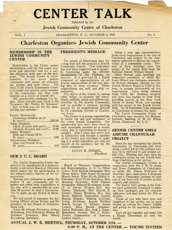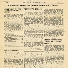 The first Jewish Community Center in Charleston opened at 54 George Street in 1922 with Sam Rittenberg as president. The JCC’s fortunes waxed and waned over the years. Run by volunteers, it hosted a Hebrew school and other activities for children and adults. In 1945, after a span of inactivity, the organization was incorporated and hired its first director, Nat Shulman; programs took place in its two-story brick building at 58 St. Philip Street.