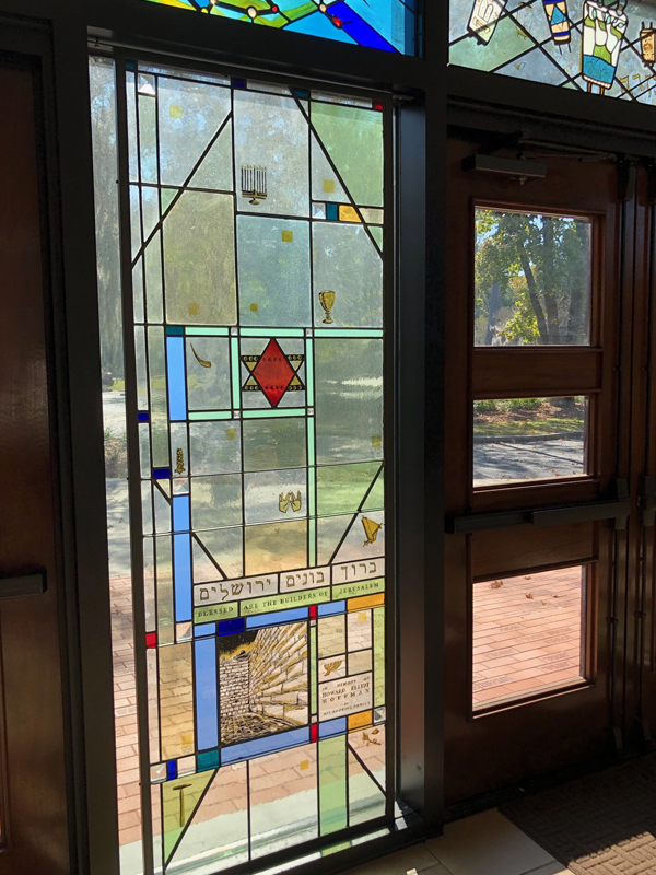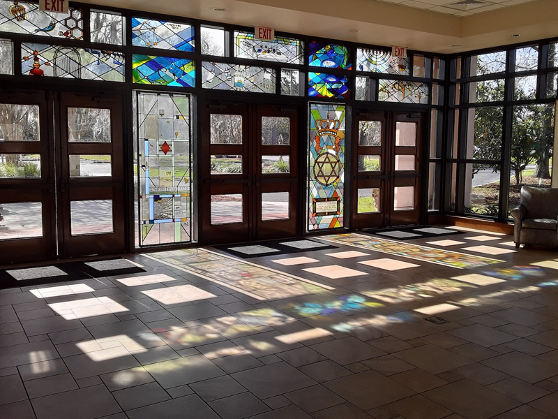 In 1977, the Gordon Street property was sold, and the congregation met temporarily at the new JCC west of the Ashley, using the Gaillard Municipal Auditorium for High Holidays and Kahal Kadosh Beth Elohim’s temple for events such as bar and bat mitzvahs. In 1978, members broke ground for a new synagogue on Windsor Drive in West Ashley. The construction was completed in ’79, and the congregation began holding services in a modern sanctuary designed by Atlanta architect Benjamin Hirsch. In September 1989, Hurricane Hugo struck Charleston, damaging the roof of the synagogue and downing 179 trees on the property. In 2008, Emanu-El underwent renovations, including the construction of a new lobby, lit through a wall of stained glass, and the reorganization of offices and library space.
